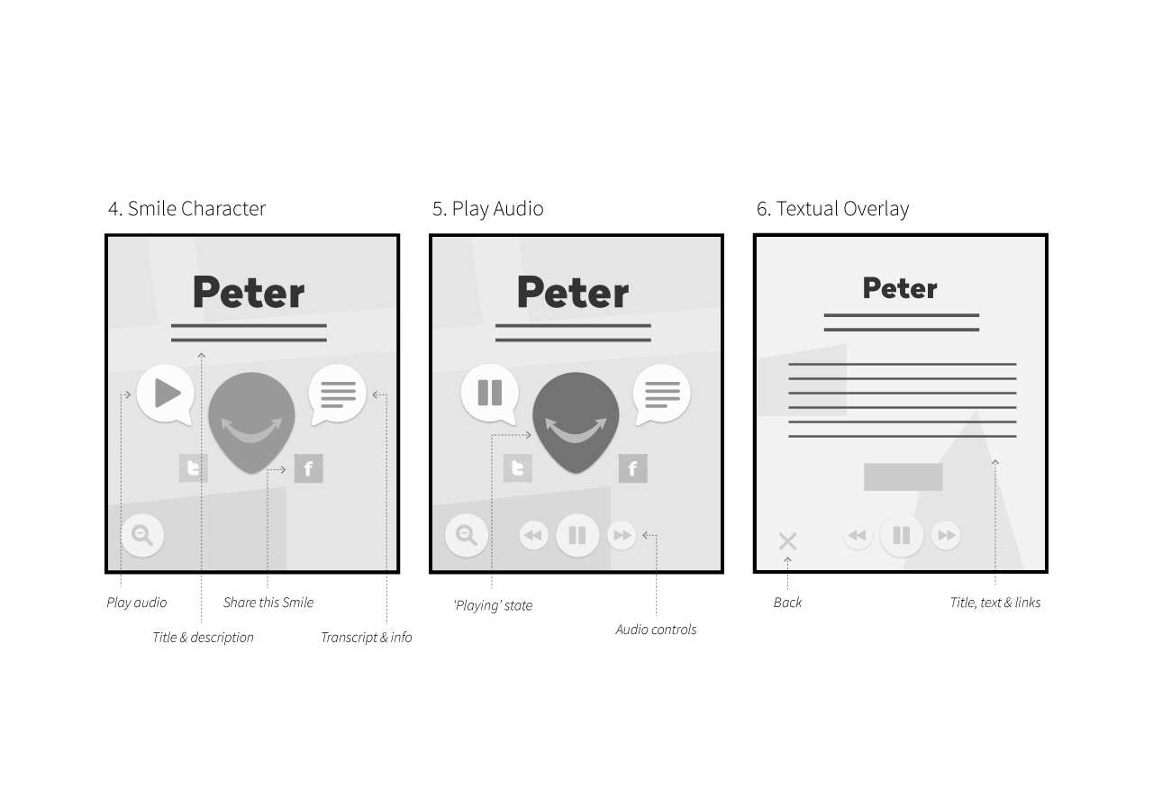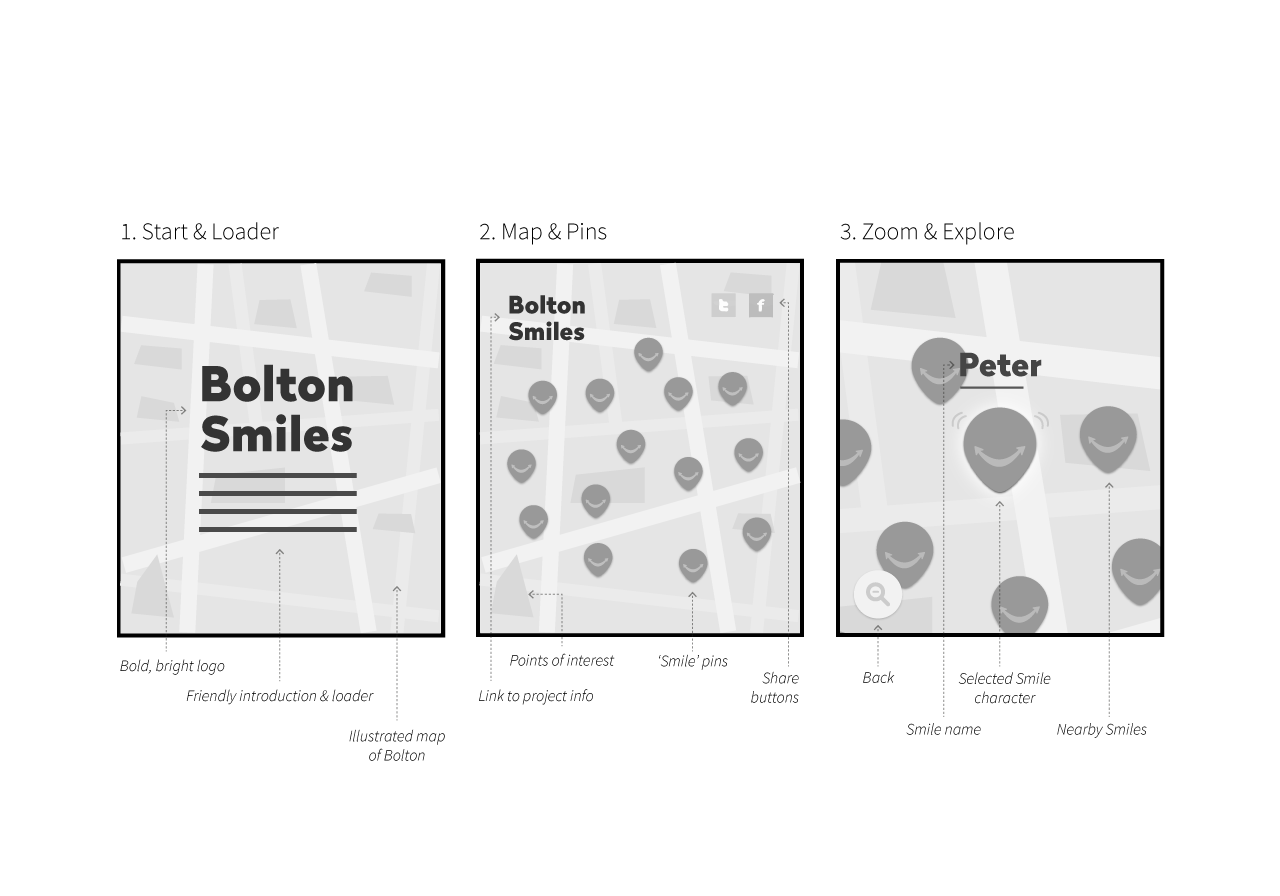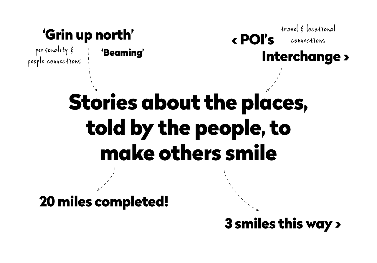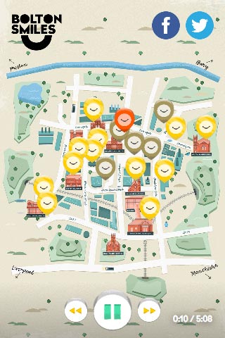Delightful 'smiles' were placed in and around the town centre's well-known landmarks, uncovering tales from a diverse set of voices. Extra effort was made to standardise the experience on a wide range of device browsers.