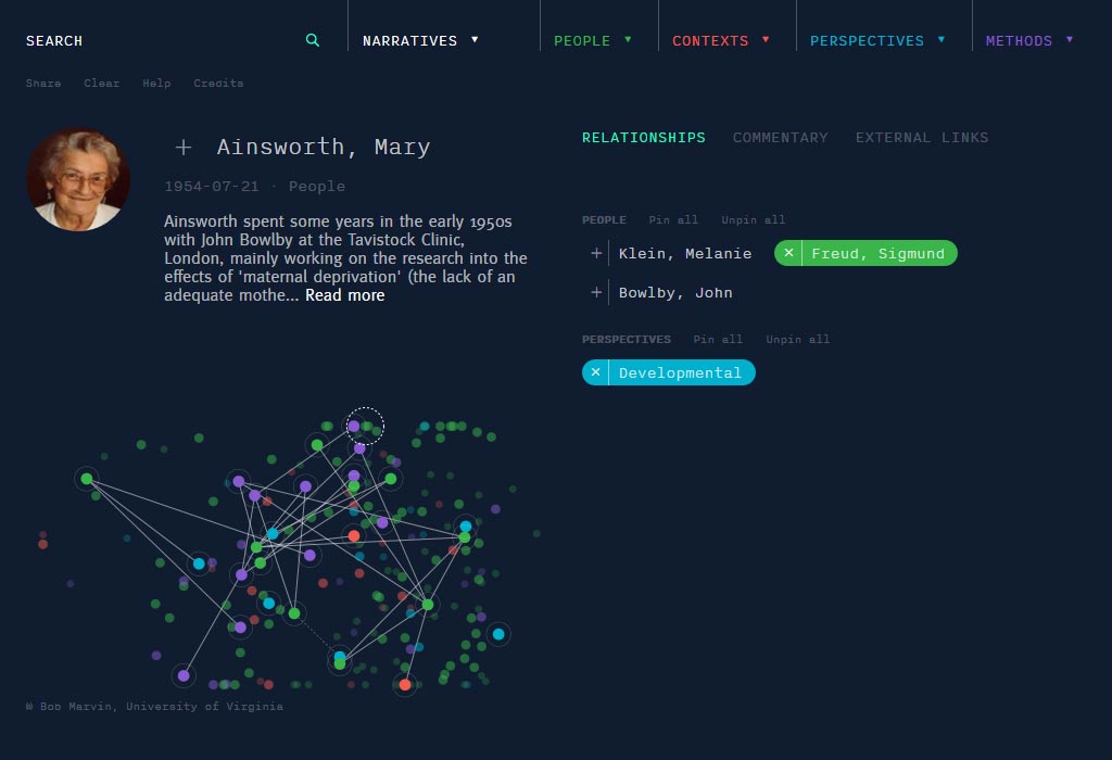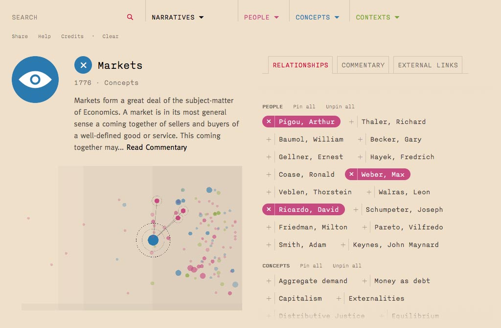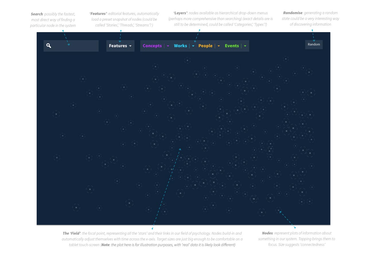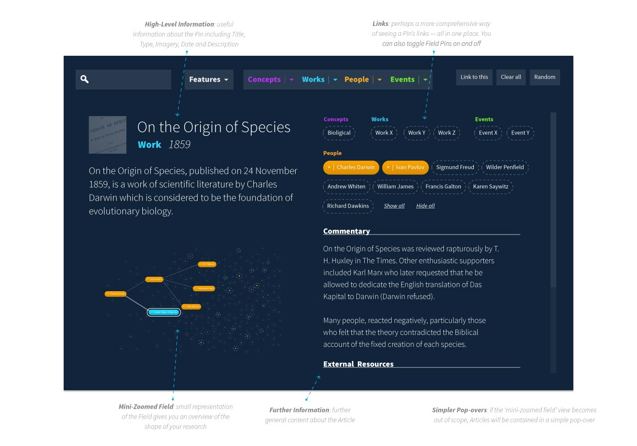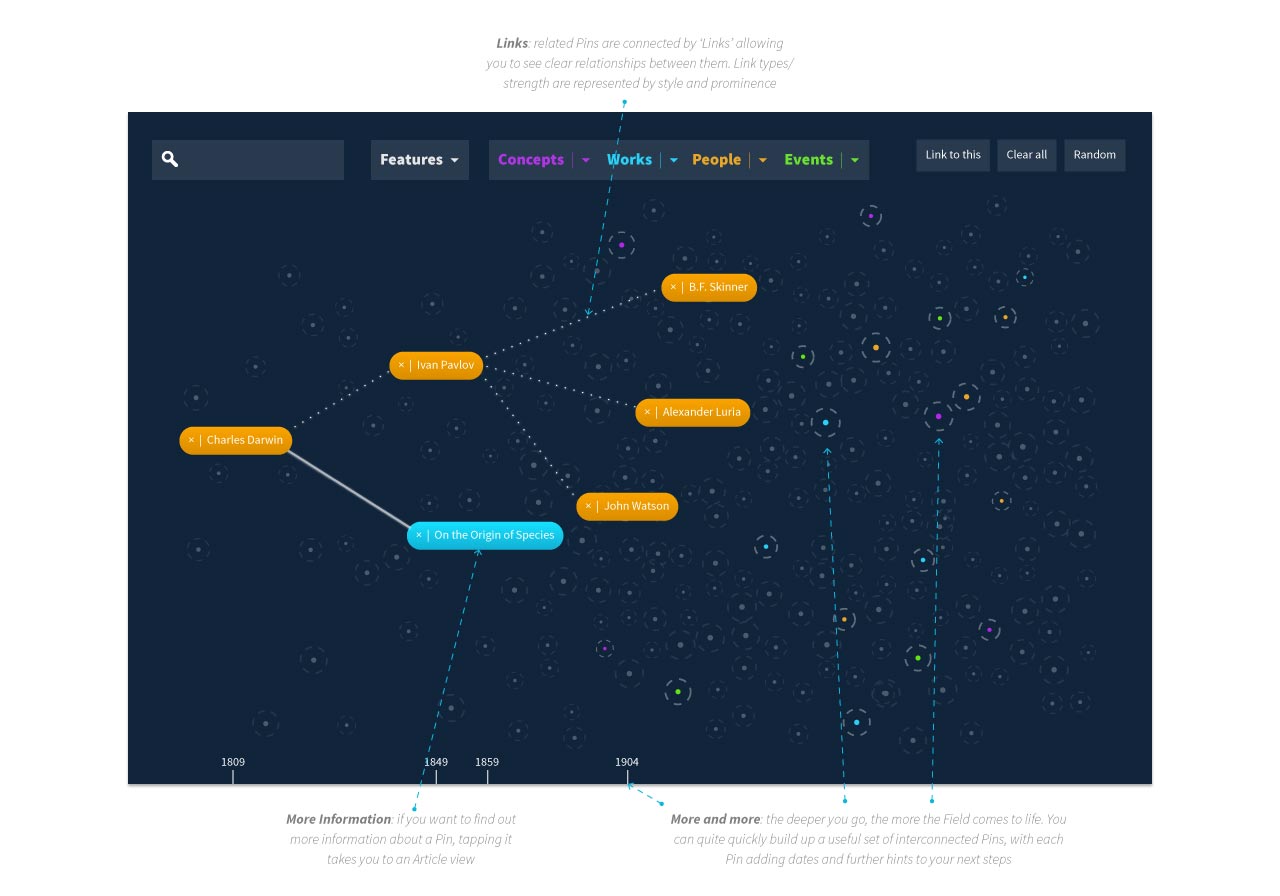 The sleek and simple ‘starfield’ plots the development of the subject, encouraging countless chance entry-points. Straight search and menus also allow direct access to what you’re looking for. We later enhanced the format with editorial narratives to further engage and educate the audience.